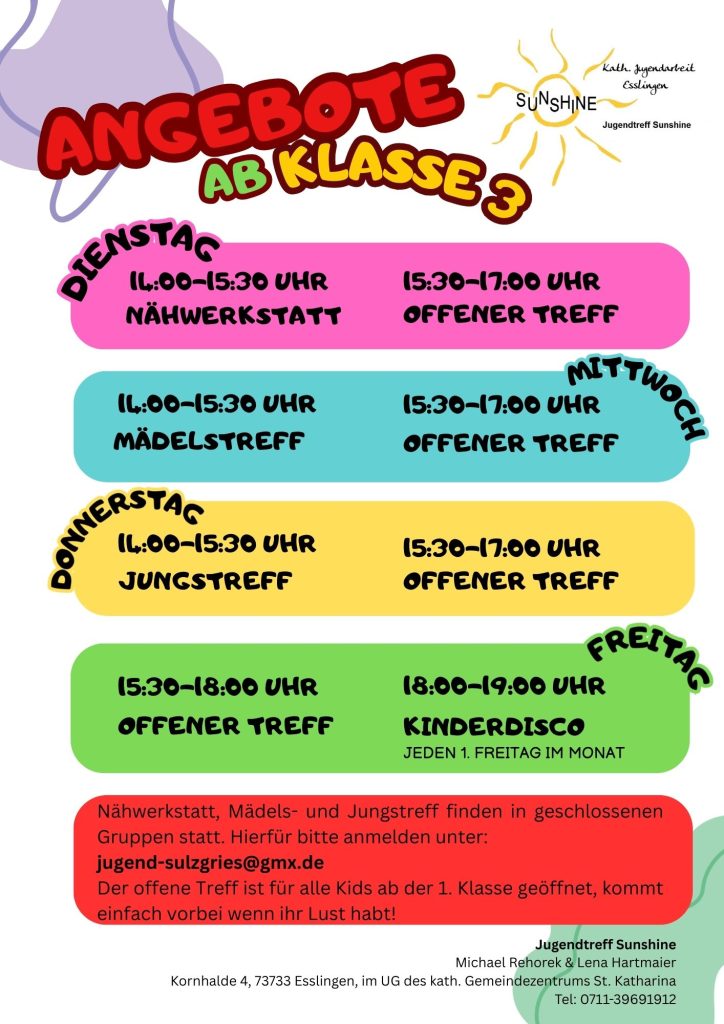 Veranstalter ist unsere Katholische Jugendarbeit „Sunshine“ mit Michael Rehorek und Lena Hartmaier. Bei ihnen bekommst Du auch weitere Infos. Kontakt: jugend-sulzgries@gmx.de oder Tel. 0711-39691912
