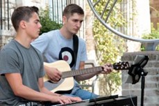 eine Gruppe von jungen Erwachsenen mit Instrumenten und Gesang. Sie probt auf die jeweiligen Auftritte hin, die sie inzwischen im gesamten Stadtgebiet hat.