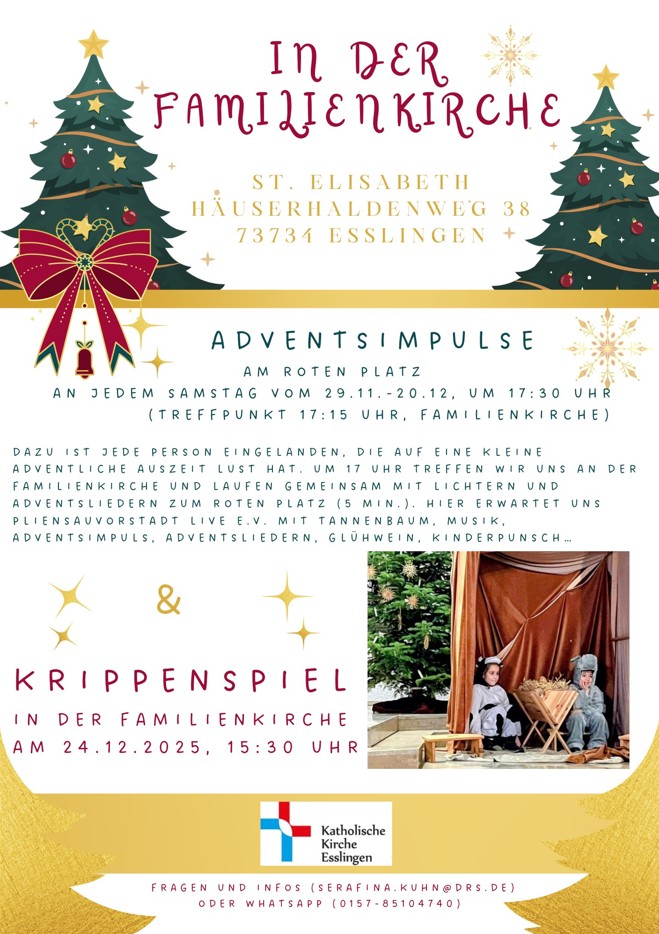 In der Familienkirche Esslingen wird am 24. Dezember 2025 um 15:30 Uhr ein Krippenspiel aufgeführt. Kinder und Helfer können sich bis 7. November anmelden. Die 4 Proben, mit Spiel- und Vesperpausen, finden an den Adventssamstagen statt und beginnen für alle, die wollen, mit einem gemeinsamen Mittagessen! Die Generalprobe ist dann am Montag, 22.12.2025. Um 17 Uhr enden die Samstagsproben mit einem gemeinsamen Lichterlauf zum Adventsimpuls am Roten Platz.