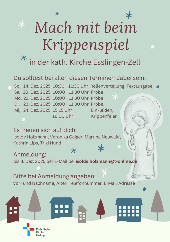 Auch dieses Jahr findet in St. Albertus ein Krippenspiel statt. Die Proben dafür finden Ende Oktober jeweils am Samstagvormittag statt. Wir freuen uns über viele Kinder, die mitspielen möchten in großen oder kleinen Rollen. Bitte meldet Euch bis zum Montag, 20.10. im Pfarrbüro von St. Albertus an unter stalbertus.esslingen@drs.de. Weitere Infos folgen dann. Sabine und Andreas Balle