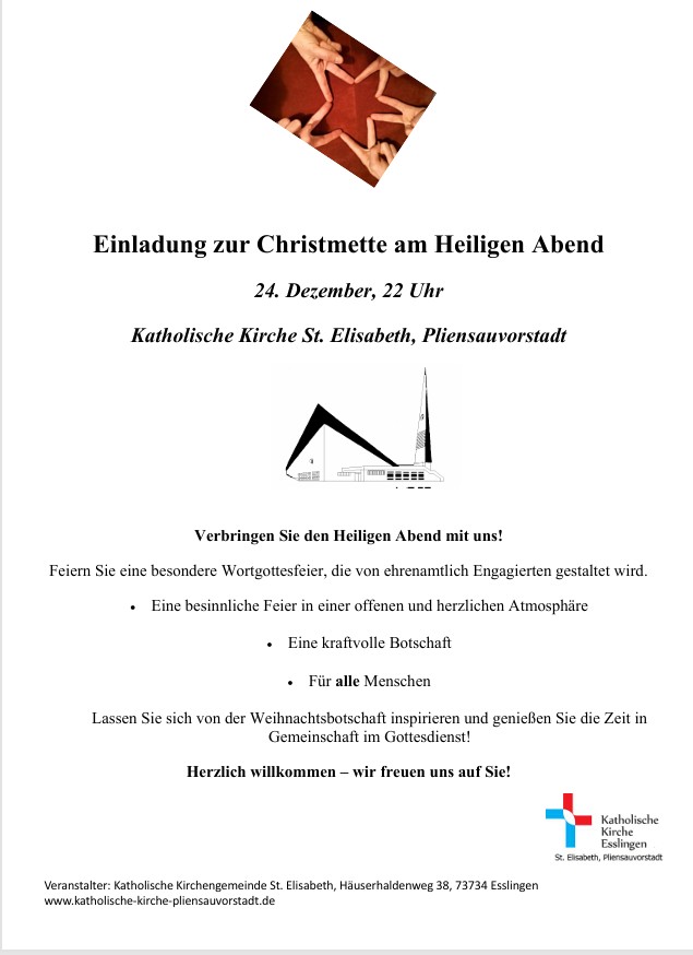 Christmette in St. Elisabeth Termin Details Datum: 24. Dezember 2025 22:00 – 23:00 Veranstaltungsort: St. Elisabeth Anschrift: Häuserhaldenweg 38 PLZ, Ort: 73734, Esslingen-Pliensauvorstadt Bundesland: Baden-Württemberg