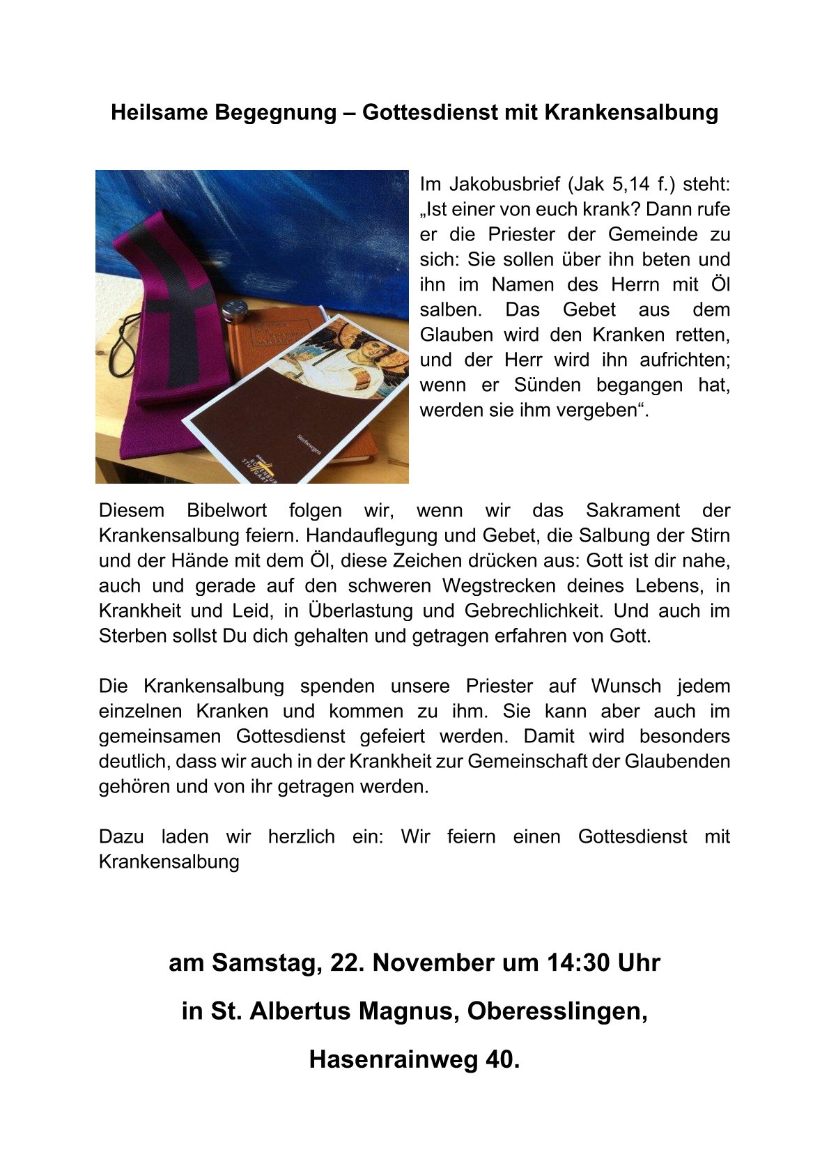 Gottesdienst mit Krankensalbung in St. Albertus Termin Details Datum: 22. November 2025 14:30 Veranstaltungsort: St. Albertus Magnus Anschrift: Hasenrainweg 40 PLZ, Ort: 73730, Esslingen-Oberesslingen Bundesland: Baden-Württemberg