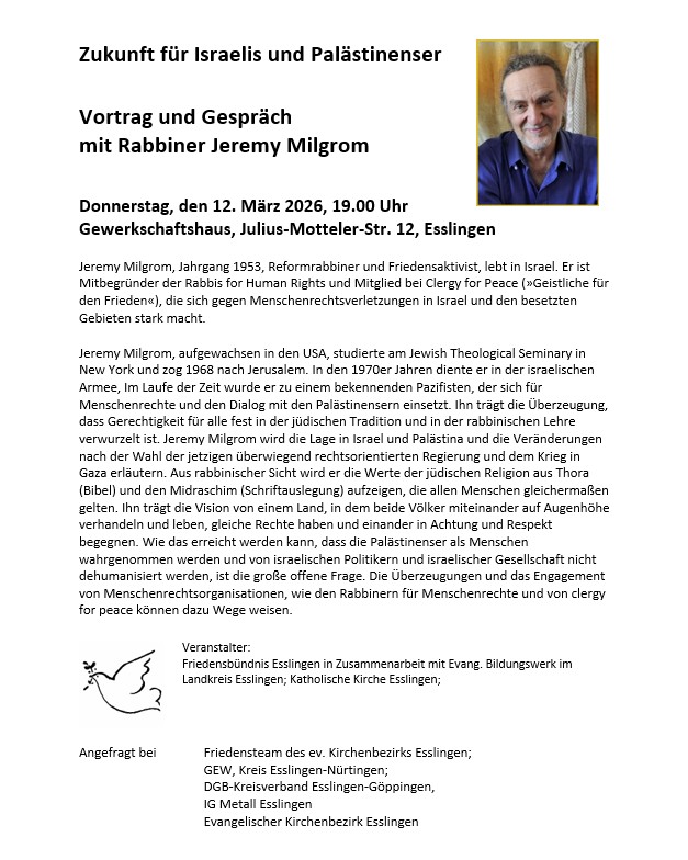 Vortrag und Gespräch mit Rabbiner Jeremy Milgrom Termin Details Datum: 12. März 2026 19:00 – 21:00 Veranstaltungsort: Gewerkschaftshaus Anschrift: Julius-Motteler-Straße 12 PLZ, Ort: 73728, Esslingen Bundesland: Baden-Württemberg