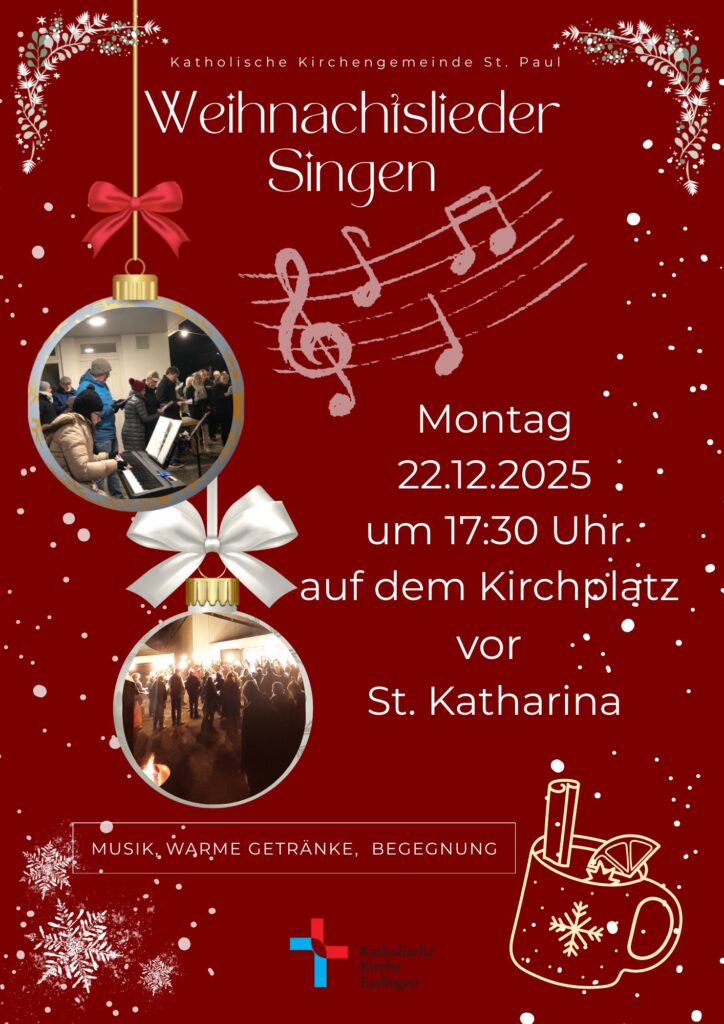 Weihnachtslieder Singen um 17:30 Uhr vor St. Katharina Termin Details Datum: 22. Dezember 2025 17:30 – 18:30 Veranstaltungsort: St. Katharina Anschrift: Kornhalde 4 PLZ, Ort: 73733, Esslingen-Sulzgries Bundesland: Baden-Württemberg