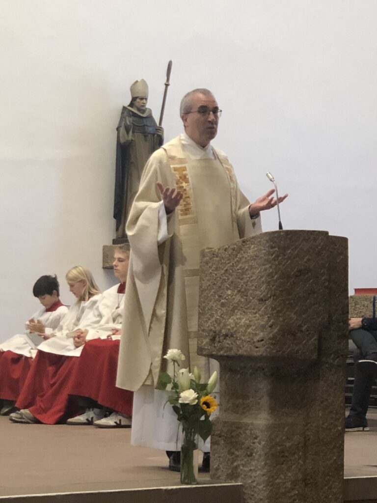 Seit 75 Jahren feiern und teilen Menschen ihren Glauben in St. Albertus, das ist ein Grund für Dank und Freude. Im Festgottesdienst am Sonntag, 19. Oktober lenkte Pfr. Stefan Möhler den Blick zurück in eine ganz andere Zeit. Die Schautafeln in der Kirche zeigen Bilder vom Kirchenbau direkt nach dem 2. Weltkrieg, wir sehen viele Menschen, die trotz Armut und Not an ihre Vision glaubten und auf der Kirchenbaustelle in großer Gemeinschaft und mit viel Vertrauen ein gewaltiges Gotteshaus errichtet haben. Seither hat sich Vieles in Gesellschaft und Kirche verändert, wir leben und glauben anders, aber auch heute befinden wir uns wieder auf einer Kirchenbaustelle, so Pfarrer Stefan Möhler in seiner Predigt. „Lasst euch als lebendige Steine zu einem geistigen Haus aufbauen, zu einer heiligen Priesterschaft“ – hörten wir im 1. Petrusbrief – das ist ein Auftrag an uns, Kirche mit weniger Menschen einladend und gut zu gestalten. Ein „Weiter so“ kann es, so Stefan Möhler nicht geben, am Schwerpunktort „Kirche der Begegnung“ können wir aber als Bauleute Kirche einladend und mit vielen neuen Ideen gestalten, „lassen wir uns von den Bauleuten damals ermutigen, die Kirche hoffnungsvoll in eine gute Zukunft zu führen“.