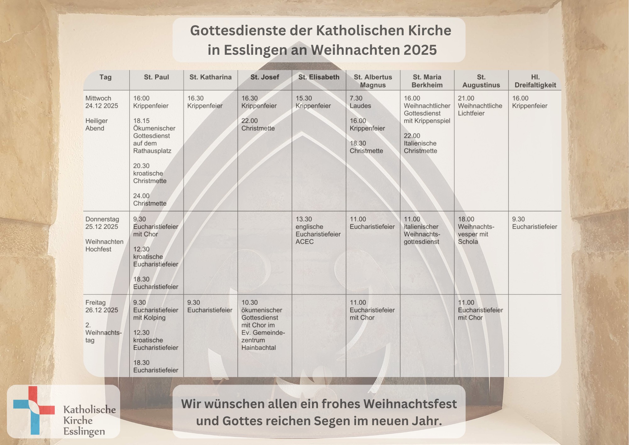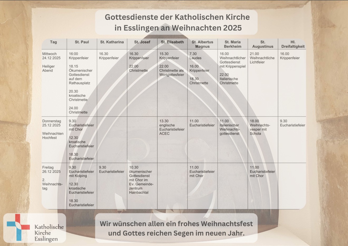 Gottesdienste der Katholischen Kirche Esslingen an Weihnachten 2025 November 17, 2025 by Birgit Hagelkrüs | No Comments